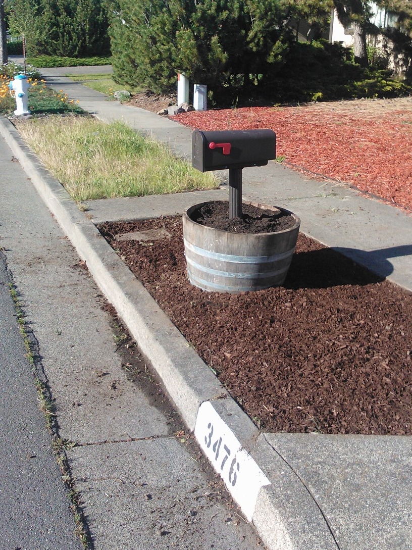 Back to the mailbox...our mailbox was a rotting/leaning mess. In our neighborhood you have to have your mailbox out at the street...otherwise we would just attach one to our house. We thought we could revamp our existing mailbox with some spray paint but after we took it down we realized it was probably going to be easier to buy a new one. We also knew we wanted to place it in a used half wine barrel. Luckily right down the street from us a man sells them for $18. Steal! We took a trip to Home Depot and found a plastic (no rust) mailbox kit for $29.
